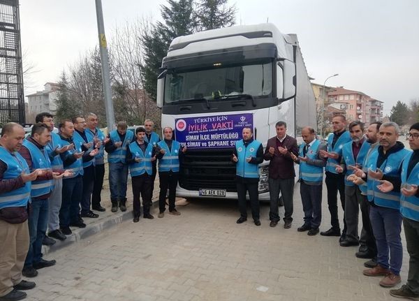 Simav ve Şaphane ilçe müftülüklerinin birlikte hazırladıkları gıda tırının uğurlamasında Simav İlçe Müftüsü Hasan Serçe tarafından dua edildi.