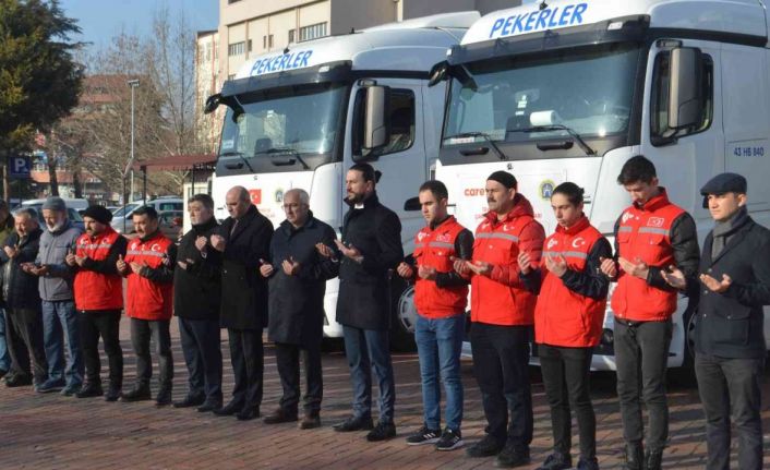 Cumhuriyet Meydanı’na konuşlanan yardım tırları; Kaymakam Hayrettin Baskın, Belediye Başkanı Mustafa Güler, Müftü Mevlüt Hakan Asan, Başkan Yardımcıları Naci Erarslan, Mehmet Ali Akar ve Furkan Dinçer ile Dernek yöneticileri tarafından uğurlandı.