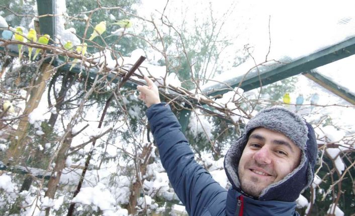 Uysal, “Muhabbet kuşları eksi derecelerde bile üreyebildi, yuvalarda yavrularımız var. Yavrular bile burada büyüyebiliyor. Hiçbir sıkıntı yok. Bu sene -12 dereceyi gördü burası. Sultan papağanı, kanaryalarda kışın üreme olmadı. Kuşların keyifleri iyi. Şuan burada 4 tane kanarya, 2 tane sultan papağanı 30 civarı muhabbet kuşu var. Burada 2. Kışımız. Geçen kış daha soğuktu. -20 dereceyi gördü. Dün yuvadan atlayan yavrular bile gördüğünüz gibi yaşıyor. Sular gün içinde donuyor. Gün içinde 2-3 defa sularını değiştiriyoruz. Pekmezli suyumuzda ısınmalarına yardımcı oluyor” diye konuştu.