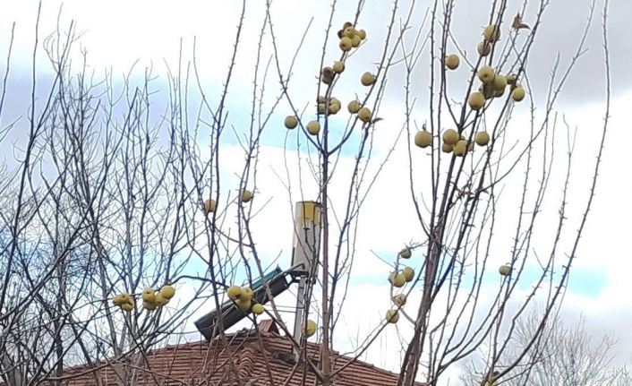 Beyköy yolu üzerinde bulunan bir evin bahçesindeki yaprakları dökülmüş elma ağacının toplanmayan meyvelerin oluşturduğu ilginç görüntü yoldan geçenlerin ilgisini çekiyor.