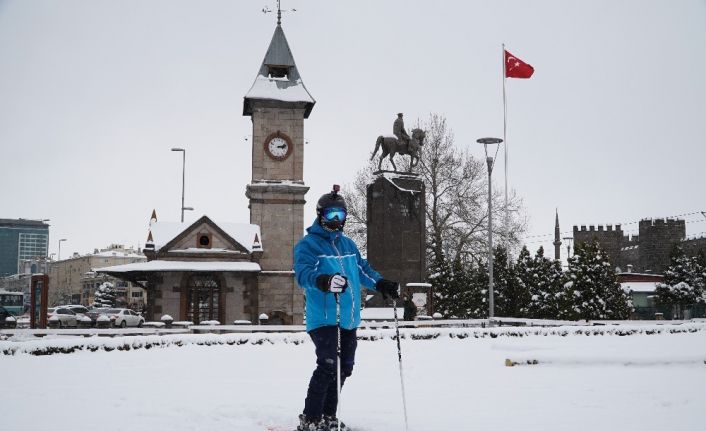 Yol kenarında biriken karların ve kaldırımlardaki karların üzerinden kayarak şehir merkezine ulaşmaya çalışan 28 yaşındaki kayakçının bu ilginç yolculuğu yaklaşık 1 saat sürdü.