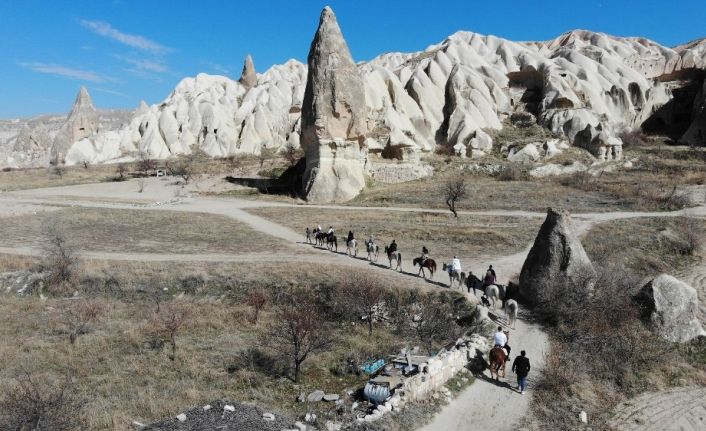 Türkiye’nin önemli turizm merkezlerinden Kapadokya Bölgesinde 14 Şubat Sevgililer Günü yoğunluğu yaşanıyor. 14 Şubat Sevgililer Günü dolayısıyla tercihlerini Kapadokya’dan yana kullanan yerli ve yabancı turistlerin ilgisiyle birlikte bölgede bulunan otellerde yüzde 90 oranında doluluk yaşandığı öğrenildi. Sevgililer Günü’nü bölgede geçiren turistlerin ATV ve at turlarına katılarak bölgenin eşsiz güzelliklerini gezme fırsatı bulurken turistlerin katılmış olduğu ATV ve at turları havadan görüntülendi.