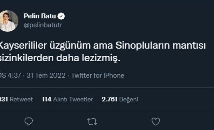 Ünlü oyuncu Pelin Batu, Kayserilileri üzecek bir paylaşımda bulunarak Sinop mantısının Kayseri mantısından daha güzel olduğu yorumunu yaptı, paylaşımına büyük beğeni yağdı.