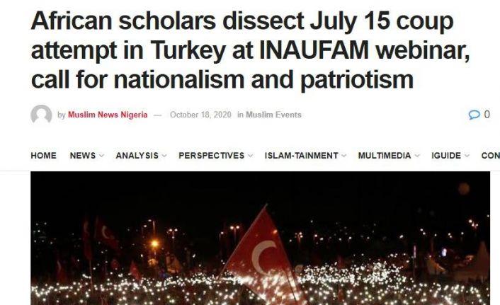 Nijerya basınından Muslim News Nigeria, İNÜAFAM’ın 15 Temmuz konulu webinarına yer verdi. Afrikalı araştırmacılar, İNÜAFAM webinarında Türkiye’deki 15 Temmuz darbe girişimini ele aldı. Muslim News Nigeria, "Vatanseverlik ve milliyetçilik çağrısında bulundu" başlığıyla Afrika kamuoyuna 15 Temmuz mücadelesini duyurdu. İngilizce yayımlanan haberde “Malatya-Türkiye’deki İnönü Üniversitesi Afrika Araştırmaları Merkezi tarafından organize edilen webinarın en güçlü vurgusu Afrikalıların ortaya koyması gereken vatan ve millet sevgisi oldu” ifadelerine yer verildi.