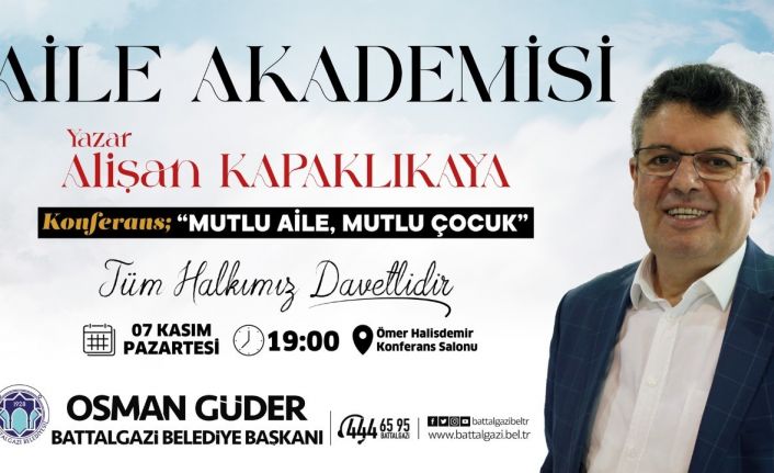 Eğitimci-Yazar Alişan Kapaklıkaya, Malatya Battalgazi Belediyesi tarafından ailelere rehberlik etmesi amacıyla hayata geçirilen “Aile Akademisi” programları çerçevesinde Battalgazililerle buluşuyor. 7 Kasım Pazartesi günü saat: 19.00’da Şehit Ömer Halisdemir Konferans Salonu’nda düzenlenecek olan programda Yazar Kapaklıkaya, teknoloji ile aile arasındaki bağları Battalgazililerle paylaşacak.