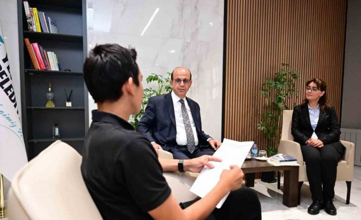 Kernek Anadolu Lisesi 10’uncu Sınıf öğrencileri Muhammed Ümeyr Akkaya, Semih Keten ve Umut Avcu, Türk Dili ve Edebiyatı Öğretmeni Arzu Kirnik eşliğinde gerçekleştirdikleri ziyarette, okulun haber sitesi için Başkan Geçit’le röportaj yaptı.