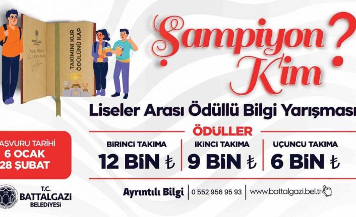 Battalgazi Belediyesi lise öğrencilerine yönelik bilgi yarışması düzenleyecek. “Şampiyon Kim” adlı yarışma 27 bin TL’lik ödül havuzuyla gençlerin bilgi birikimini taçlandırmayı hedefliyor.