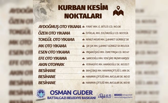 Battalgazi Belediye Başkanı Osman Güder, 31 Temmuz 3 Ağustos tarihleri arasında kutlanacak olan Kurban Bayramında vatandaşların kurbanlarını rahat bir ortamda kesmeleri için 10 adet kurban kesim yerinin vatandaşların hizmetinde olacağını bildirdi.