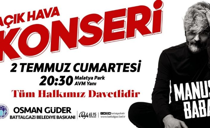 Malatya Battalgazi Belediyesi tarafından 2 Temmuz Cumartesi günü saat 20.30’da düzenlenecek olan açık hava konserinde Ünlü sanatçı Manuş Baba, Malatya Park AVM Yanı Konser alanında Battalgazililerle buluşacak.