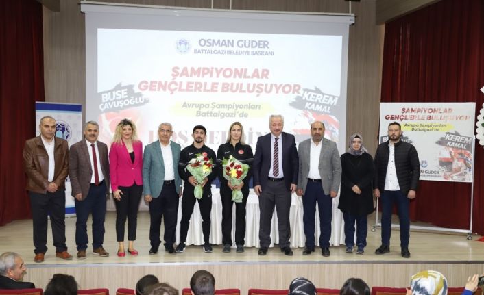 Malatya’nın Battalgazi Belediyesi tarafından “Şampiyonlar Gençlerle Buluşuyor” programı çerçevesinde Macaristan’da düzenlenen Avrupa Güreş Şampiyonası’nda madalya ile dönen milli güreşçi Kerem Kamal ve Buse Tosun Çavuşoğlu, spor hayatlarında başarıya giden yolu Battalgazi’deki gençlerle paylaştı.
