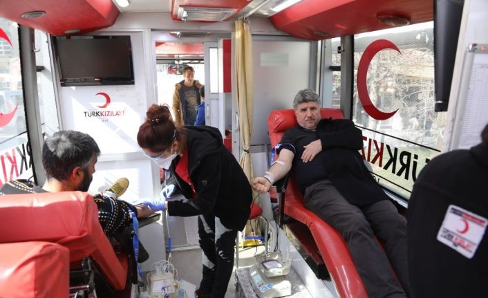 Vatandaşlar çarşı merkezinde kurulan kan alma ünitelerinde kan bağışında bulundu.