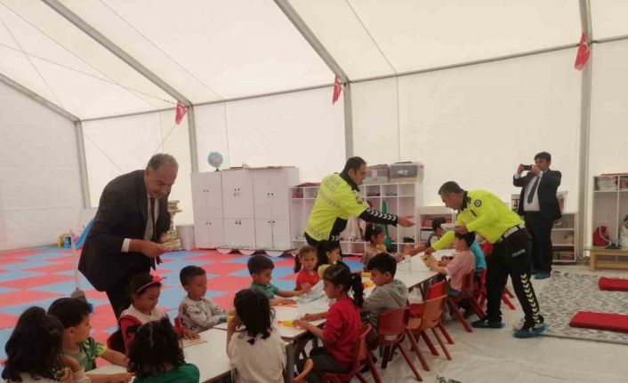 Malatya’da polis tarafından depremzede öğrencilere trafik kuralları ve güvenliği eğitimi verildi.