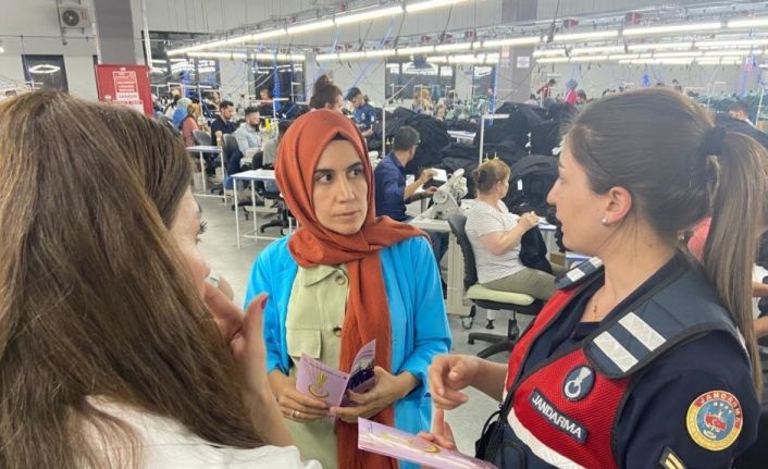 Malatya İl Jandarma Komutanlığı görevlileri, Kadın Destek Uygulaması (KADES) konusunda fabrikada çalışanlara bilgilendirme faaliyetlerini sürdürüyor.