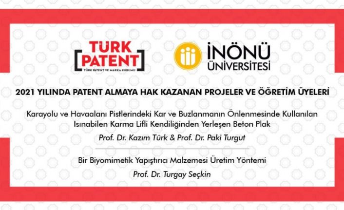 İnönü Üniversitesi Kimya Bölümü Öğretim Üyesi Prof. Dr. Turgay Seçkin’in “Bir Biyomimetik Yapıştırıcı Malzemesi Üretim Yöntemi” başlıklı buluşu incelemeli olarak patent alırken, İnşaat Mühendisliği Bölümü öğretim üyeleri Prof. Dr. Kazım Türk ve Prof. Dr. Paki Turgut’un “Karayolu ve Havaalanı Pistlerindeki Kar ve Buzlanmanın Önlenmesinde Kullanılan Isınabilen Karma Lifli Kendiliğinden Yerleşen Beton Plak” başlıklı buluşu ise Patent Belgesi almayı başardı.