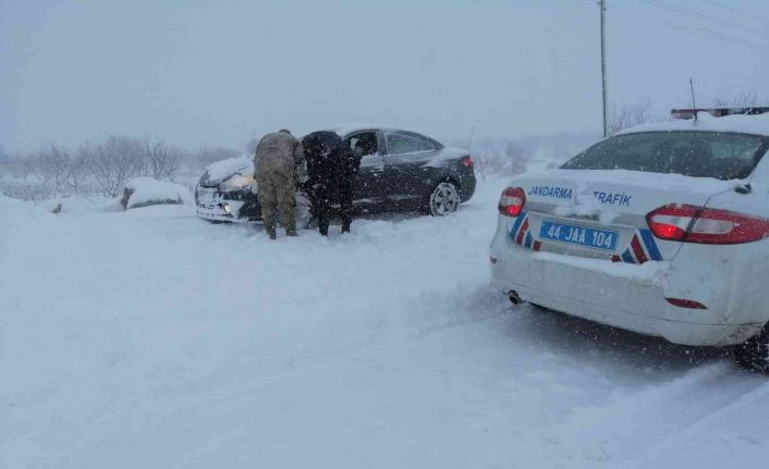 Malatya İl Jandarma Komutanlığı Asayiş ve Trafik timlerince, karda yolda kalanlara yardım yapılıyor.