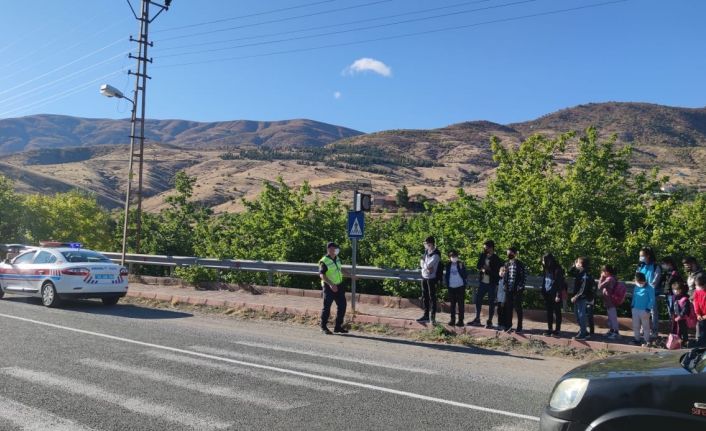 Jandarma ekipleri nezaretinde yaya kaldırımlar üzerinden karşıya geçen öğrencilere uymaları gereken kurallar hakkında da bilgi verildi.