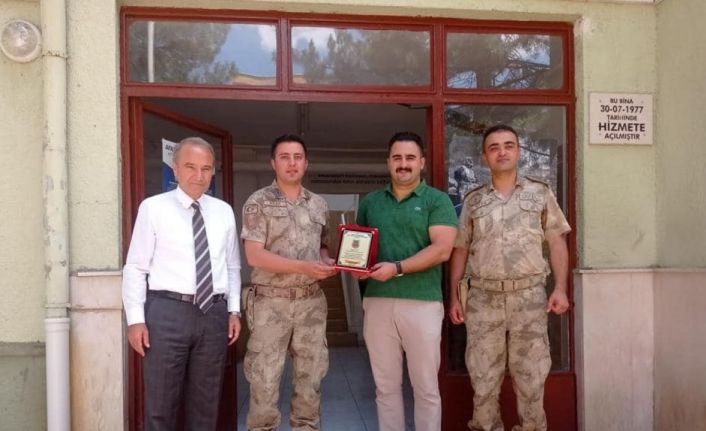 Kaymakam Ülkü, tayini çıkan jandarma personellerine ilçeye göstermiş olduğu fedakar çalışmaları nedeniyle plaket vererek yeni görevlerinde başarı dileklerinde bulundu.