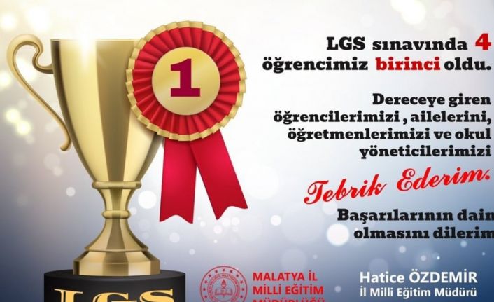LGS 2022’de Türkiye genelinde 193 Türkiye birincisi çıktı. Bu öğrencilerin 4’ünün Malatya’dan olduğu belirtildi. Malatya İl Milli Eğitim Müdürü Hatice Özdemir, sosyal medyada yaptığı açıklamada, “LGS sınavında 4 öğrencimiz birinci oldu. Dereceye giren öğrencilerimizi, ailelerini, öğretmenlerimizi ve okul yöneticilerimizi tebrik ederim. Başarılarının daim olmasını dilerim” ifadelerine yer verdi.