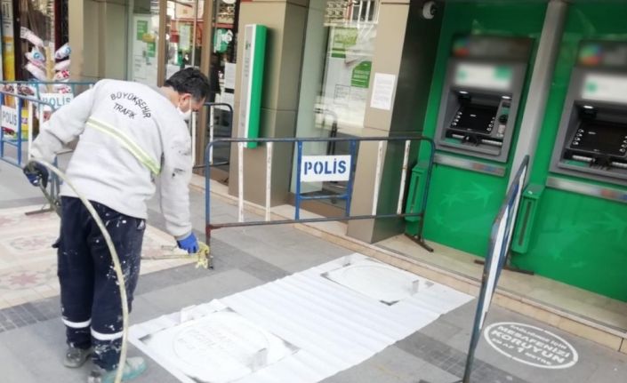 Büyükşehir Belediyesi Ulaşım Hizmetleri Dairesi Başkanlığı tarafından “Sağlığınız İçin Mesafesini Koruyun, En az 1 Metre” çalışmaları ile vatandaşların ortak kullanım yaptıkları alanlarda sosyal mesafenin korunmasına dikkat çekiyor. İlk yazı uygulaması, banka (ATM) otomatik vezne makineleri önlerine yapıldı.
