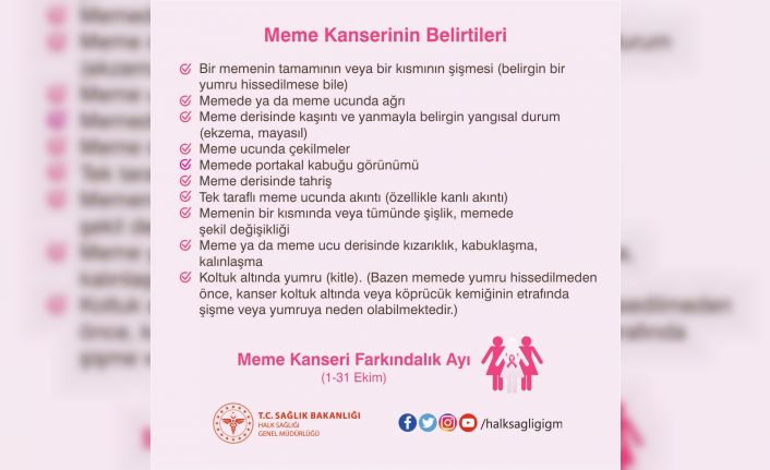 Kadınların korkulu rüyası olan meme kanserinin belirtileri konusunda yapılan açıklamada ise kitlenin önemine dikkat çekilip, “Meme kanserinin en sık rastlanan belirtisi, memede ağrısız, zamanla büyüyen bir yumrunun (kitlenin) ele gelmesi, hissedilmesidir. Ayrıca ele gelen yumru (kitle) olsa da olmasa da aşağıdaki belirtiler de meme kanserinde görülebilmektedir. Memede ya da meme ucunda ağrı, Meme derisinde kaşıntı ve yanmayla belirgin yangısal durum (ekzema, mayasıl), meme ucunda çekilmeler, Memede portakal kabuğu görünümü, Meme derisinde tahriş, Tek taraflı meme ucunda akıntı- özellikle kanlı akıntı, Koltuk altında yumru (kitle), Memenin bir kısmında veya tümünde şişlik, memede şekil değişikliği, Meme ya da meme ucu derisinde kızarıklık, kabuklaşma, kalınlaşma şeklinde ortaya çıkar” denilerek, bunlara karşı dikkatli olunması istendi.