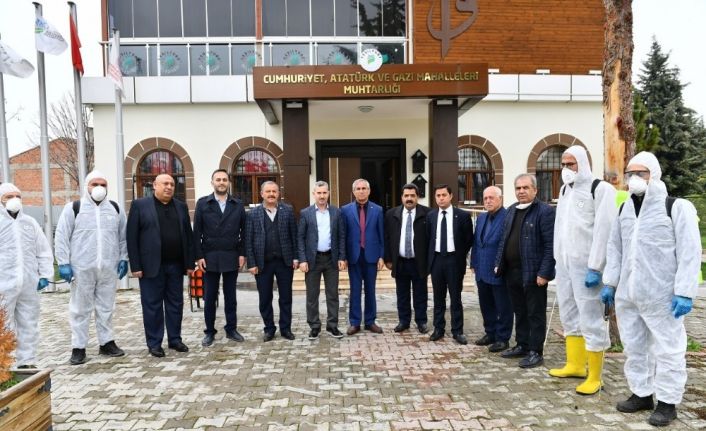 Gazi, Atatürk ve Cumhuriyet Mahalle Muhtarlığının birlikte hizmet verdiği Muhtar Evinde gerçekleşen dezenfektan çalışmalarını takip eden Yeşilyurt Belediye Başkanı Mehmet Çınar, Yeşilyurt’un her noktasında dezenfektan çalışmalarına yoğunluk verdiklerini söyledi.