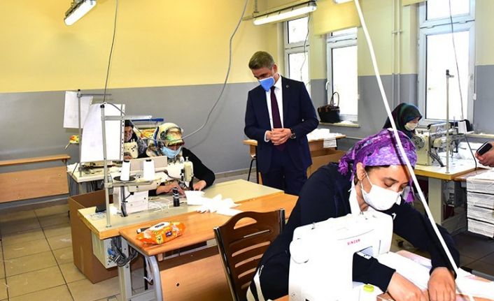 Fatma Aliye İMKB Mesleki ve Teknik Anadolu Lisesi’nde halk eğitim merkezinde görevli 30 usta öğretici tarafından günde 6 bin adet N95 tipi maske ve 60 adet cerrahi önlük üretiliyor. Üretimin yapıldığı okulda incelemede bulunan Malatya Valisi Aydın Baruş, üretim yapılan atölyeyi gezdi. Vali Baruş, atölyeler ve üretim ile ilgili İl Milli Eğitim Müdürü Ali Tatlı ve Okul Müdürü Ulviye Işık’tan bilgi aldı. İl Milli Eğitim Müdürlüğünce alınan yeni maske üretim makinesi ile günlük üretimi 3 katına çıkardıklarını belirten Okul Müdürü Ulviye Işık, günde yaklaşık 6 bin adet N 95 tipi maske ve yeni kurulan atölyede ise günlük 60 adet cerrahi önlük üretildiğini kaydetti.