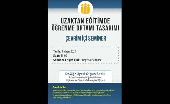 Malatya İnönü Üniversitesi’nde uzaktan eğitim mesleki gelişim çalışmaları kapsamında “Uzaktan eğitimde öğrenme ortamı tasarımı” başlıklı bir çevrimiçi seminer verilecek.