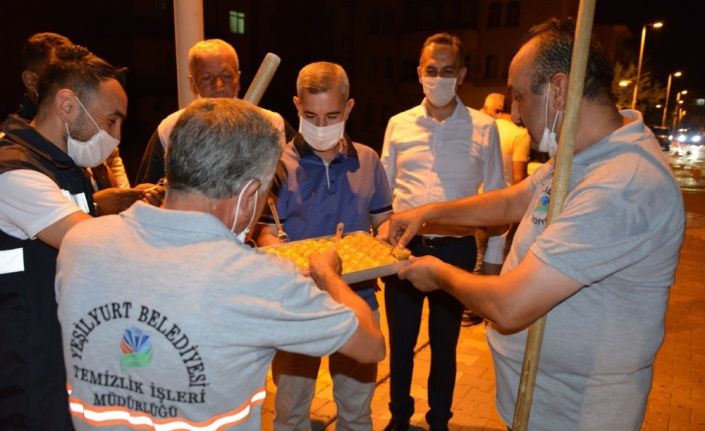 Yeşilyurt Belediye Başkanı Mehmet Çınar, ilçenin farklı bölgelerinde kurulan pazar yerlerindeki hizmetlerin tamamlanmasından sonra gerçekleşen dezenfektan çalışmalarını yerinde incelerken, personellere kolaylık dileyip tatlı ikram etti.