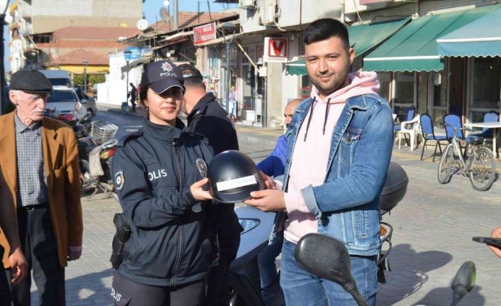 Manisa’nın Ahmetli ilçesinde İlçe Emniyet Müdürlüğüne bağlı ekipler kasksız motosiklet sürücülerini uyararak kask hediye etti.