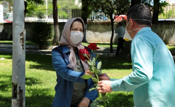 Öte yandan Akhisar Belediyesi önünden ekipler ihtiyaç duyan 65 yaş üzeri vatandaşlara maske ve gül dağıttı.