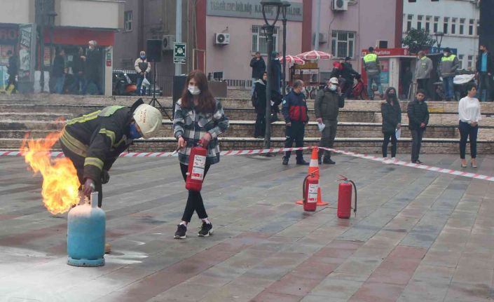 Manisa’nın Alaşehir ilçesinde, Sivil Savunma Günü etkinlikleri kapsamında öğrencilere yönelik deprem ve yangın söndürme eğitimi verildi.