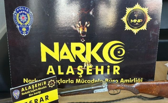 Manisa İl Emniyet Müdürlüğü Narkotik Suçlarla Mücadele Şube Müdürlüğü ve Alaşehir Narkotik Büro Amirliği ekipleri tarafından yapılan çalışmada, şüphelinin üzerinde ve adresinde yapılan aramalarda 1,5 gram metamfetamin, 51 adet sentetik ecza hapı, 2 parça halinde 50,18 gram esrar maddesi, 35 adet 9x19 mm çapında mermi ve 1 adet av tüfeği ele geçirildi.