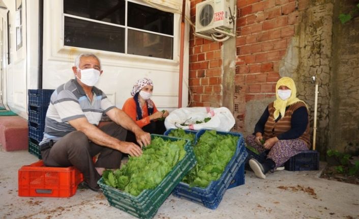 Kadınlar, korona virüsü salgını nedeniyle maskelerini takarak, sosyal mesafe kuralına uyarak topladıkları taze yaprakları kasaları döşedikten sonra, peşin parayla satıyorlar.