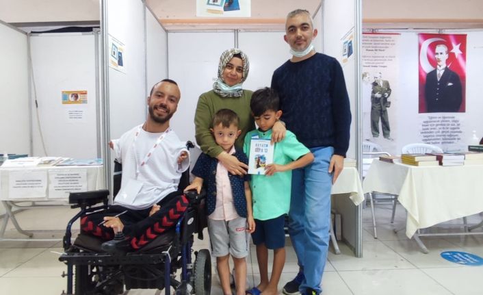 Bedensel engelli milli yüzücü Sefa Yurtkölesi, Manisa’da 4. Kitap fuarında, ilk eseri olan ve ayaklarını kullanarak yazdığı Hayatın Sefa’sı kitabını okuyucularına ayaklarıyla imzaladı.