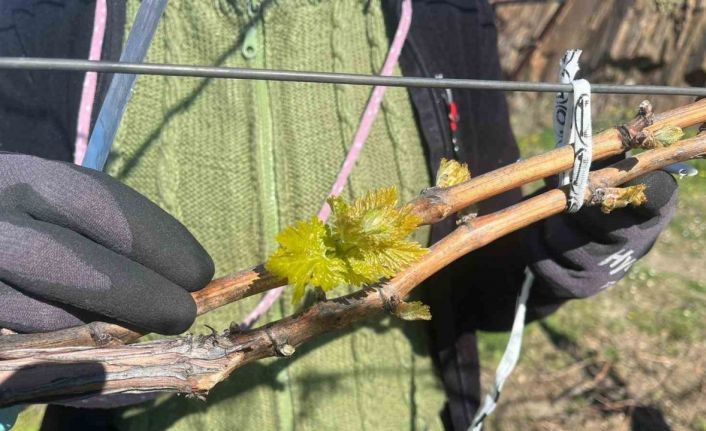 Sarıgöl’ün Tırazlar Mahallesi’nde 25 dekarlık erkenci Süperyol üzüm bağı bulunan üretici Aytaç Ünlükoç, çubuk bağlama çalışması yaptığı sırada bağ çubuklarındaki gözlerin patladığını ve yaprakların belirgin şekilde ortaya çıktığını fark etti.
