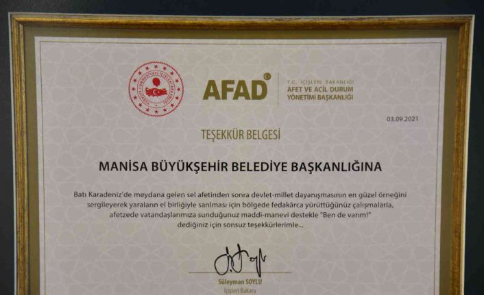 Batı Karadeniz bölgesinde meydana gelen sel felaketi sonrasında bölgedeki çalışmalara verdiği destekler nedeniyle, İçişleri Bakanı Süleyman Soylu tarafından Manisa Büyükşehir Belediyesine teşekkür belgesi gönderildi.