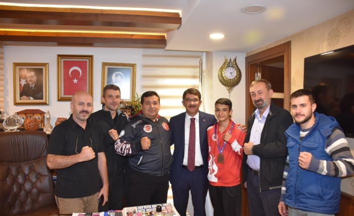 Şehzadeler Belediyesi Gençlik ve Spor Kulübü sporcusu Atakan Delikan, 65 ülkeden 850 sporcunun katıldığı Dünya Gençler Muaythai Şampiyonası’nda Milli Takım formasıyla Dünya üçüncüsü olarak başta ülkemiz olmak üzere Şehzadeler’e büyük sevinç yaşattı. Şampiyon sporcuyu, Şehzadeler Belediyesi Başkanı Ömer Faruk Çelik, makamında ağırlayarak altınla ödüllendirdi. Şampiyon sporcuya ziyareti sırasında Muaythai Federasyon Asbaşkanı Şakir Bayramoğlu, Muaythai İl Temsilcisi Mustafa Ören, Muaythai Antrenörü Yasin Çiftçi, Şehzadeler Belediye Spor Kulübü Antrenörü Kaan Levent, Ulusal Muaythai Hakemi Abdulvahit Alagöz ve Muaythai Ege Bölge Koordinatörü Ediz Barış da eşlik etti. Elde ettiği büyük başarı nedeniyle genç sporcuyu tebrik eden ve çeyrek altınla ödüllendiren Şehzadeler Belediye Başkanı Ömer Faruk Çelik, “Şehzadeler Belediyesi Gençlik ve Spor Kulübü Sporcumuz Atakan Delikan kardeşimizi elde ettiği büyük başarı nedeniyle tebrik ediyorum. Genç kardeşimiz bizlere, ülkemize büyük bir gurur yaşatmıştır. Sporcumuzun yetişmesinde emeği geçen Muaythai As Başkanı Şakir Bayramoğlu’na, Muaythai Manisa Temsilcimiz Ediz Barış’a Gençlik ve Spor İl Müdürümüz Yunus Öztürk’e, Şehzadeler Belediyesi Gençlik ve Spor Kulübü Yönetici ve hocalarımıza teşekkür ediyorum. Genç kardeşimize başarılarının devamını diliyorum” dedi.
