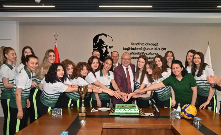 Geride kalan hafta Çanakkale’de düzenlenen 2. Lig’e terfi müsabakalarında şampiyon olan ve TVF Kadınlar 2. Ligi’ne yükselen Manisa Büyükşehir Belediyespor Voleybol Takımı, şampiyonluk kupasını Manisa Büyükşehir Belediye Başkanı Cengiz Ergün’e takdim etti. Encümen Salonu’nda düzenlenen organizasyonda Manisa BBSK Kulüp Başkanı Bora Çaylan, Voleybol Şube Sorumlusu Metin Memiş, yönetim kurulu üyeleri, teknik heyet ve şampiyon takım oyuncuları bir araya geldi. Voleybol takımı şampiyonluk kupasını, arkasında Cengiz Ergün yazan 45 numaralı formayı ve imzalı şampiyonluk topunu Manisa Büyükşehir Belediye Başkanı Cengiz Ergün’e takdim etti.