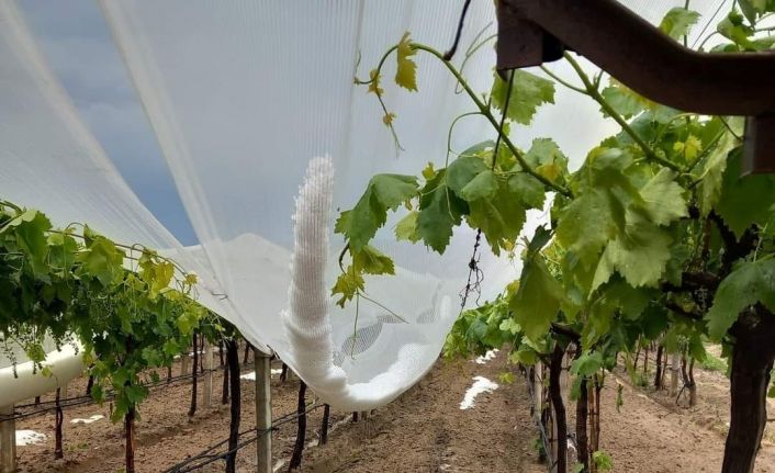 Üzüm bağlarında dolu tül yöntemiyle koruma altına alınacak bağlarda önce örtü için demirden zemin hazırlığı tamamlanıyor ardından iki ve yedi yıllık kullanım ömrü olan dolu tül örtüleri bağların üzerine yerleştiriliyor. Bu yıl dolu tül yöntemin daha çok olduğu bu nedenle de üreticiler dolu tül alabilmek için adeta sıraya girdikleri öğrenildi.