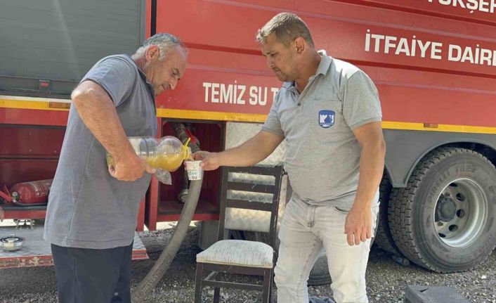 Manisa’daki orman yangınında evi yanan bir vatandaş, sıcak hava altında canla başla çalışan yangın söndürme ekiplerine erik suyu ikram etti.