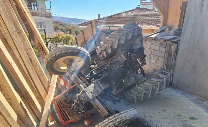 Manisa’nın Gördes ilçesinde kum yüklü traktör, freninin boşalması sonucu bir evin bahçesine girerek ters döndü. Kazada Traktör sürücüsü yaralandı.