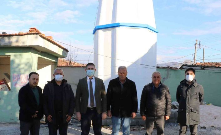 Manisa Büyükşehir Belediyesinin depremden sonra cami minaresi için harekete geçtiğini söyleyen Gelenbe Mahalle Muhtarı Mustafa Uyar inşaatı tamamlanan minarenin camiye kazandırıldığını söyledi.