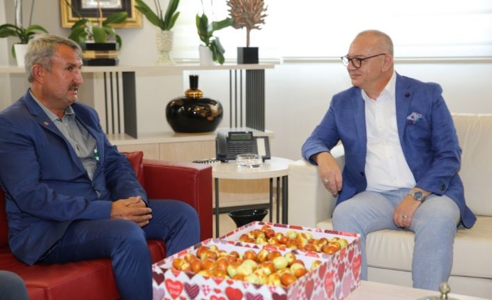 Manisa Büyükşehir Belediye Başkanı Cengiz Ergün, Demirci’den konuk ağırladı. 4 yıl önce Demirci’nin Sögütçük Mahallesi’nde üreticilere dağıtılan hünnap fidanlarının meyve vermesinin ardından Sögütçük Mahalle Muhtarı Mustafa Çiftçi ile üreticiler Bayram Ayyılmaz ve İsmail Ayaz, ilk ürünlerle birlikte Başkan Ergün’e teşekkür ziyaretinde bulundular. Ziyarette Manisa Büyükşehir Belediye Meclisi MHP Grup Başkanvekili Mehmet Güzgülü, Genel Sekreter Yardımcısı Ertuğrul Yıldırım ve Kırsal Hizmetler Dairesi Başkanı Yılmaz Usta da yer aldı. Başkan Ergün’e destekleri nedeniyle teşekkür eden Söğütçük Mahalle Muhtarı Mustafa Çiftçi, “Bugün Söğütçük Mahallesi 300-400 bin lira bu hünnap sayesinde girdi sağlıyor. Bu sene 50-55 ton ürün bekliyoruz. Hatta arazimizin bir kısmında afet yaşandı. Bu afet yaşanmasaydı 100 tona ulaşabilirdik. Ciddi satışlar oluyor. Tarladan hiçbir zahmete girmeden satış yapıyoruz. Köyümüz adına binlerce kez teşekkür ediyoruz, Allah razı olsun” dedi.
