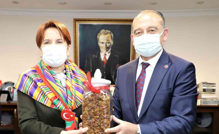 Başkan Çetin Akın, görüşmenin sonunda “Üzümün başkenti Turgutlu’dan en güzel hediye” sözleriyle kuru üzüm ve çeşitli hediyeleri Genel Başkan Akşener’e takdim etti.