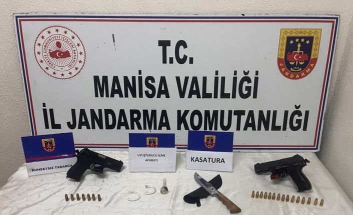 Manisa’nın Akhisar ilçesinde jandarma ekipleri tarafından yapılan asayiş uygulamasında 2 adet ruhsatsız tabanca, tabancalara ait fişekler, bıçak ve uyuşturucu içme aparatları ele geçirildi.