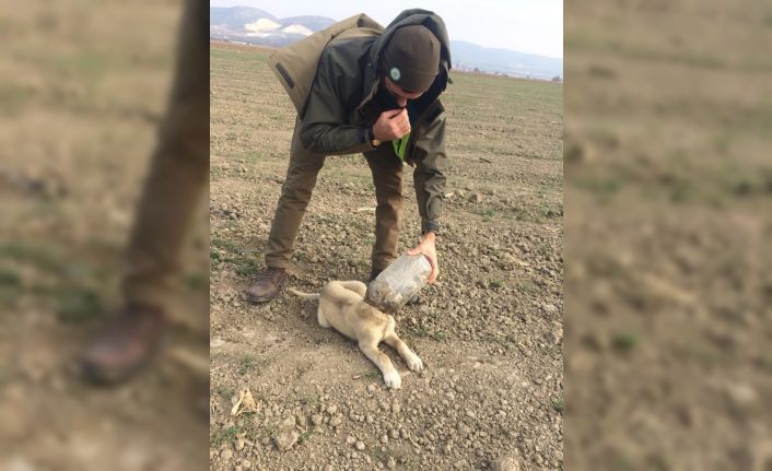 Manisa’nın Akhisar ilçesinde kafasına plastik bir şişe sıkıştığı fark edilen köpek Doğa Koruma ve Milli Parklar (DKMP) Müdürlüğü ekipleri tarafından kurtarıldı.