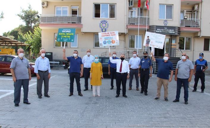 Manisa’nın Kula Kaymakamı Kemal Duru, korona virüs (Covid-19) tedbirleri kapsamında ilçe genelinde denetimlere katıldı. Kurum müdürleri ve sivil toplum kuruluşu başkanlarıyla birlikte eline, "Sağlık için hepimiz için" yazılı döviz alan Kaymakam Duru, vatandaşlara uyarılarda bulundu.