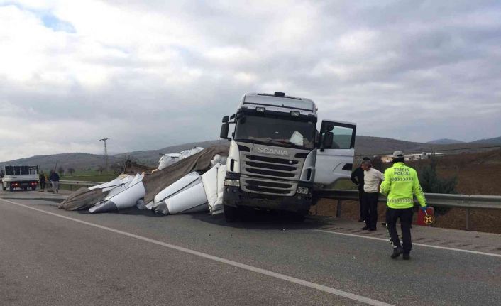 Manisa’nın Kula ilçesinde seyir halindeyken kontrolden çıkan tır, karşı şeride geçip bariyerlere çarparak durabildi. Kaza esnasında karşı yönden başka bir aracın gelmemesi olabilecek bir faciayı önlerken, tır sürücüsü de kazayı yara almadan atlattı.