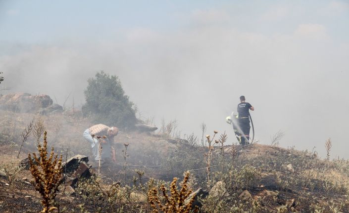 Yangın sebebiyle yol kenarındaki yaklaşık 150 metrelik kuru otlar tamamen yandı.