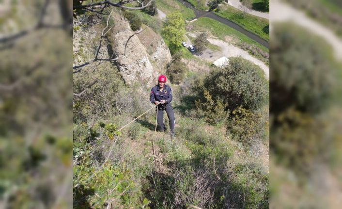 Manisa’nın Salihli ilçesinde uçurumda mahsur kalan keçi, itfaiye ekiplerinin çalışmasıyla kurtarıldı.